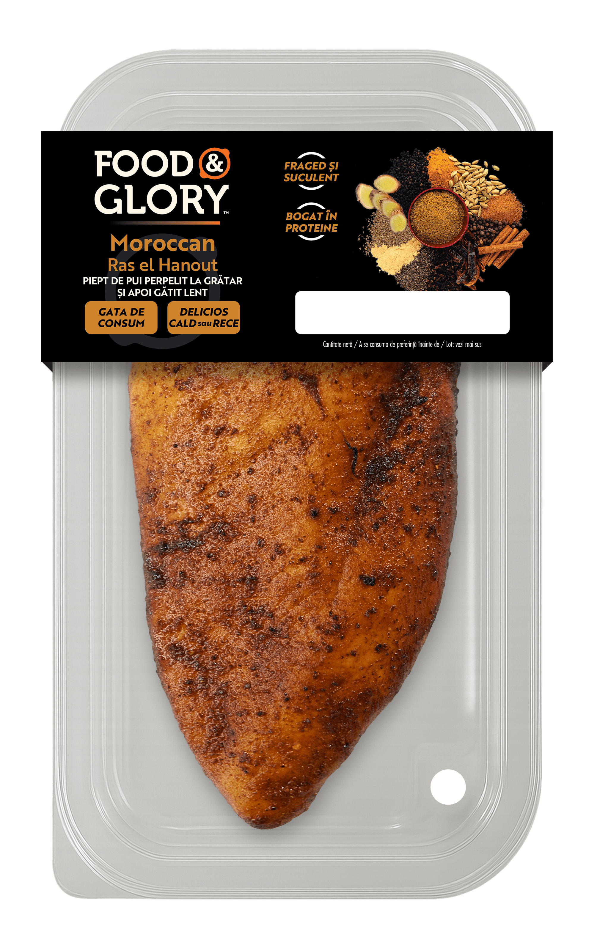 boneless, skinless chicken breast 96%, spices in variable proportions (turmeric, nutmeg, sweet paprika, ginger, cinnamon, caraway, coriander, pepper, allspice, cardamom, cumin, cloves), brown sugar, salt.