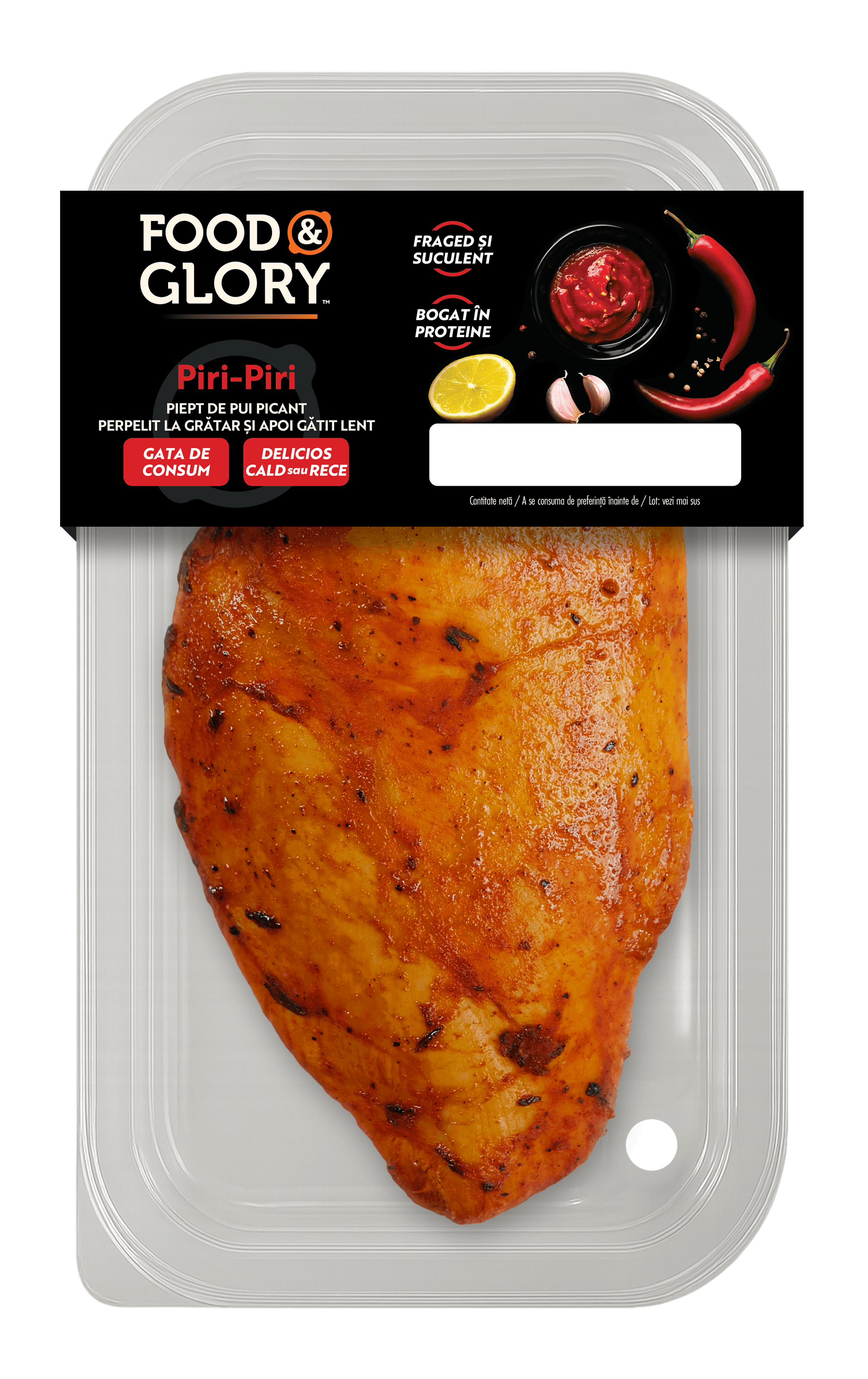 piept de pui dezosat fără piele 97%, arome, ulei de floarea soarelui, condimente în proporții variabile (ardei iute (chili), extract de boia dulce, piper negru, cimbru), sare, usturoi, ceapă, dextroză, pudră de roșii, concentrat din lămâie, oțet din vin alb, lecitină din floaera soarelui.