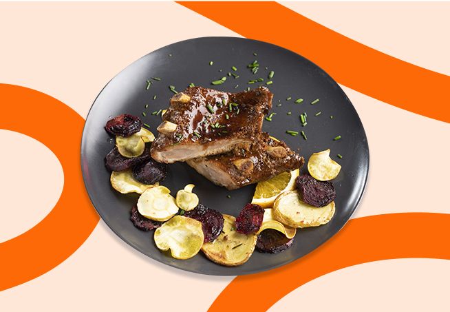 Cuptor (cu convecție) - 170 °C, timp de 35 minute: îndepartați folia de plastic, așezați coastele de porc într-un vas termorezistent și introduceți în cuptorul preîncalzit, pe raftul mijlociu.