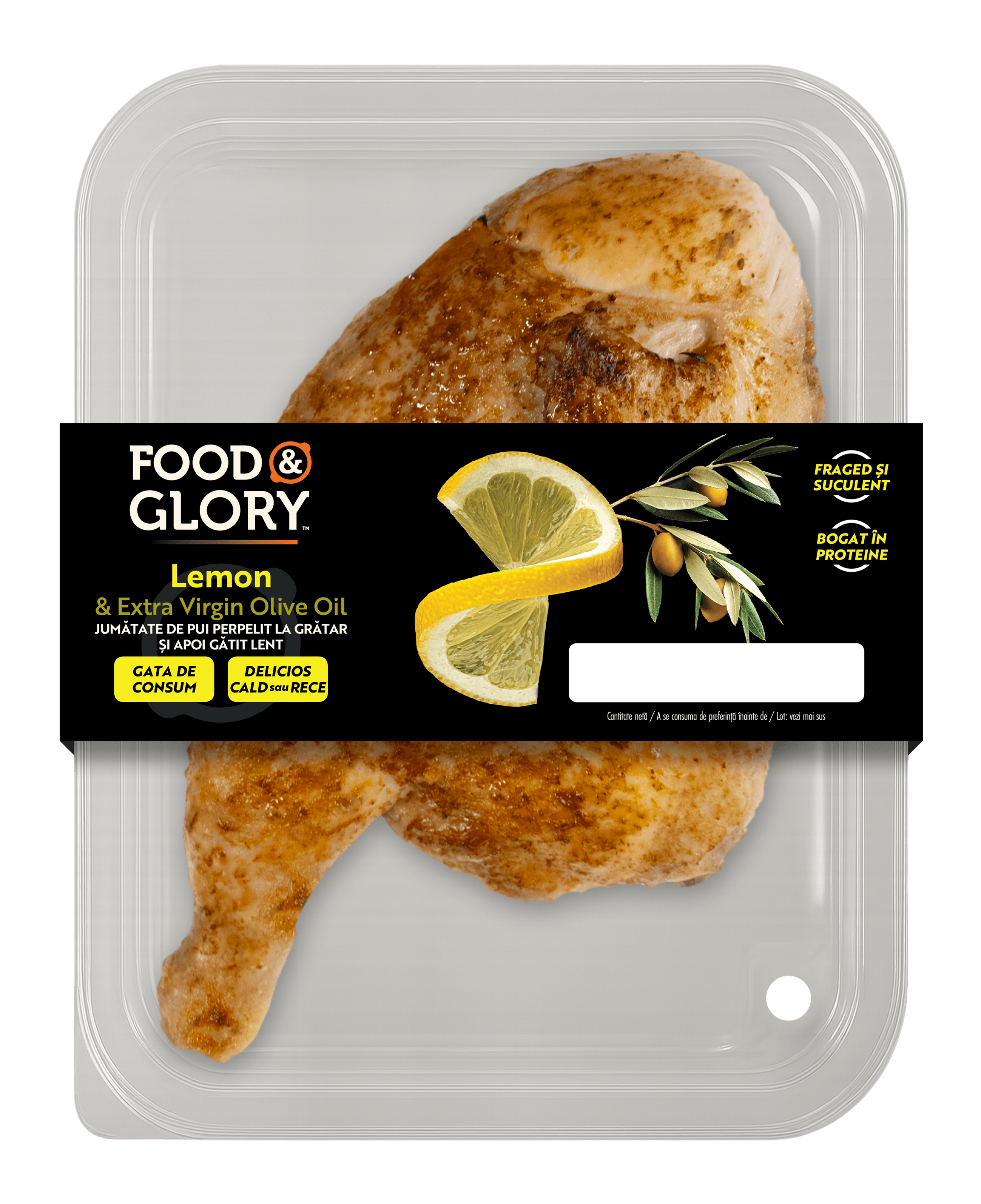 Jumătate de pui eviscerat 96%, arome, zest de lămâie (0,7%), ulei de măsline extravirgin (0,6%), sare, concentrat de lămâie, condimente în proporții variabile (piper, extract de rozmarin, cimbru, ghimbir, MUȘTAR), dextroză, zahăr brun, usturoi, ceapă.
