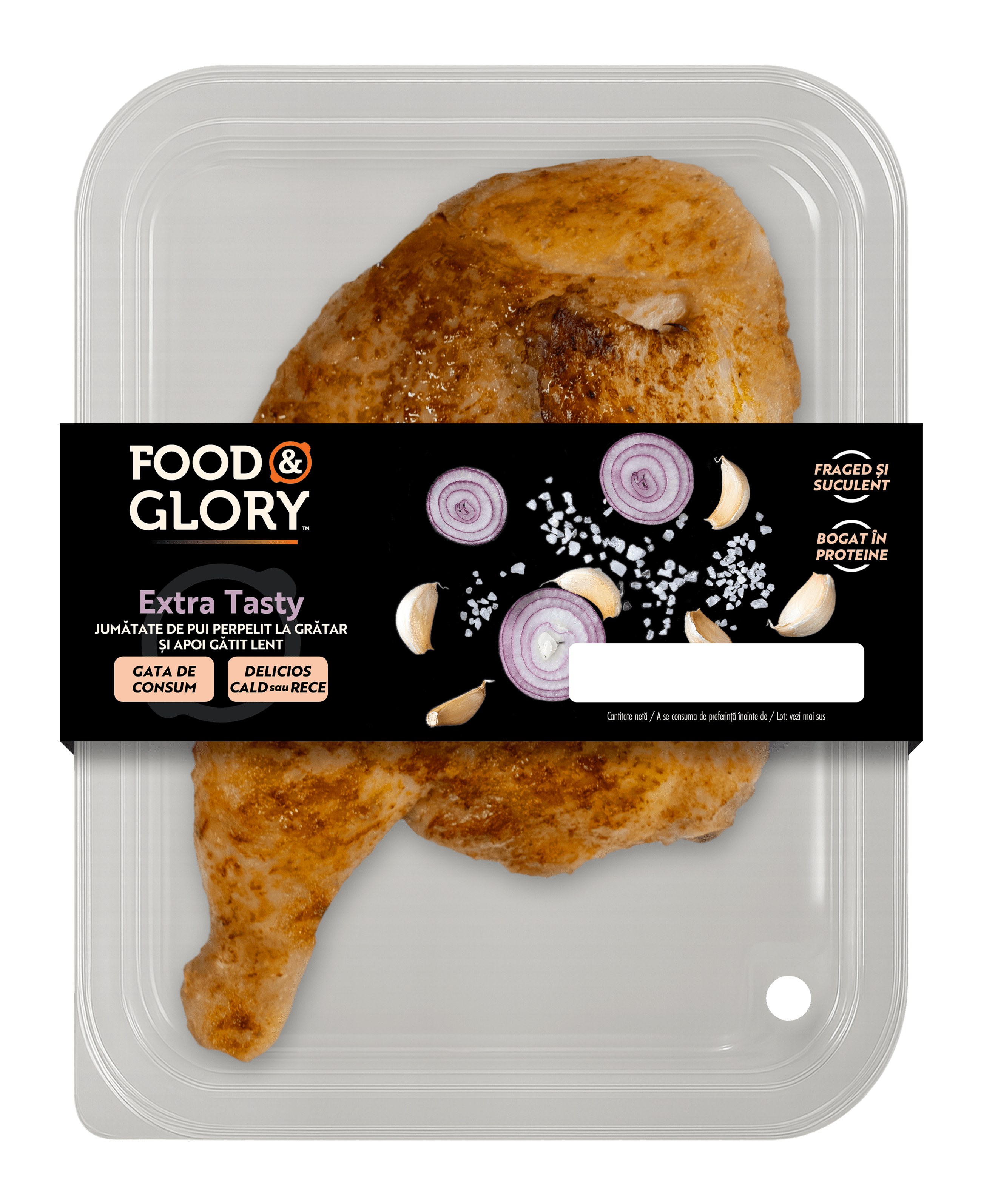 jumătate de pui eviscerat 96%, sare, arome, dextroză, usturoi, ceapă, extract de drojdie.