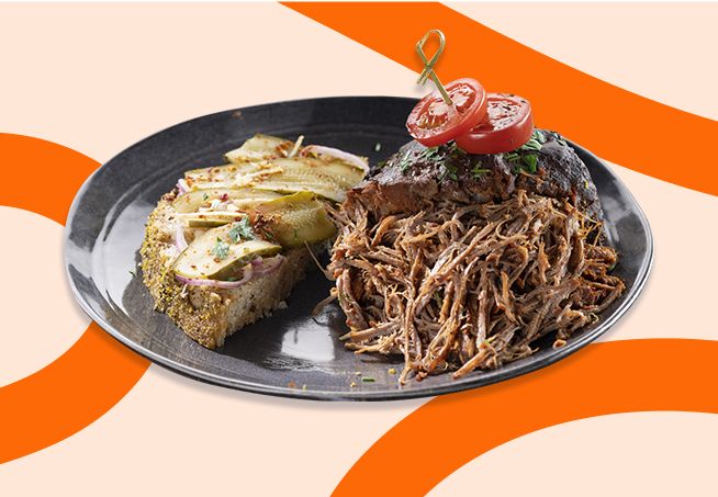 Desfaceți carnea în fâșii, folosind 2 furculițe. Serviți ca friptură cu garnitura preferată sau tăiați carnea în felii groase și serviți în burger sau sendviș, împreună cu legume feliate.